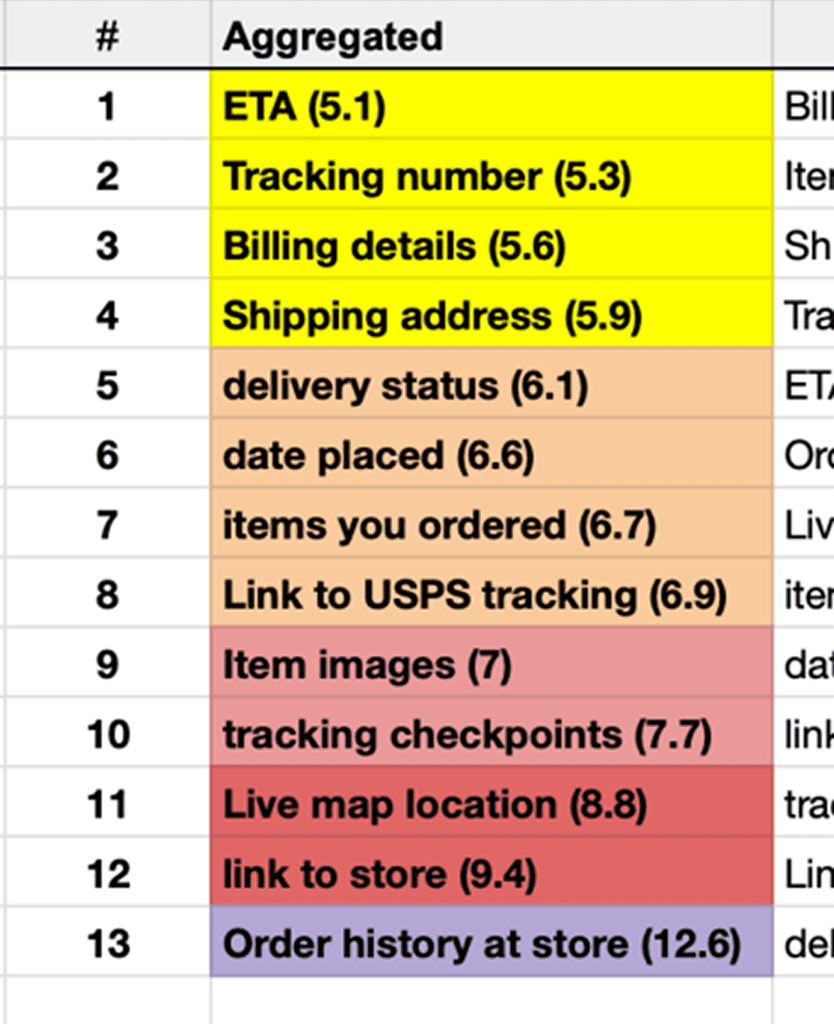 Card sorting showed that users prioritize leading markers, like ETAs, tracking numbers, and statuses, over lagging markers like last location.