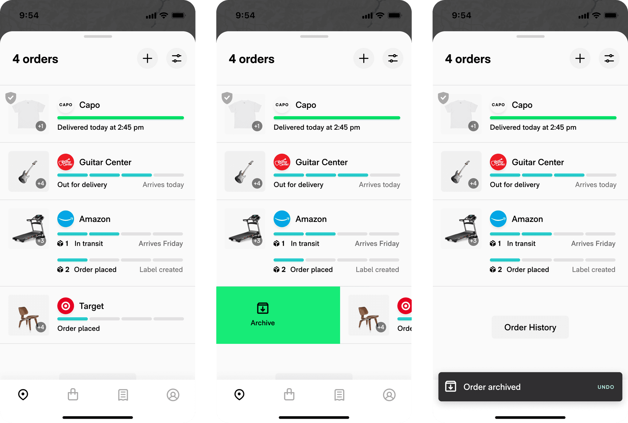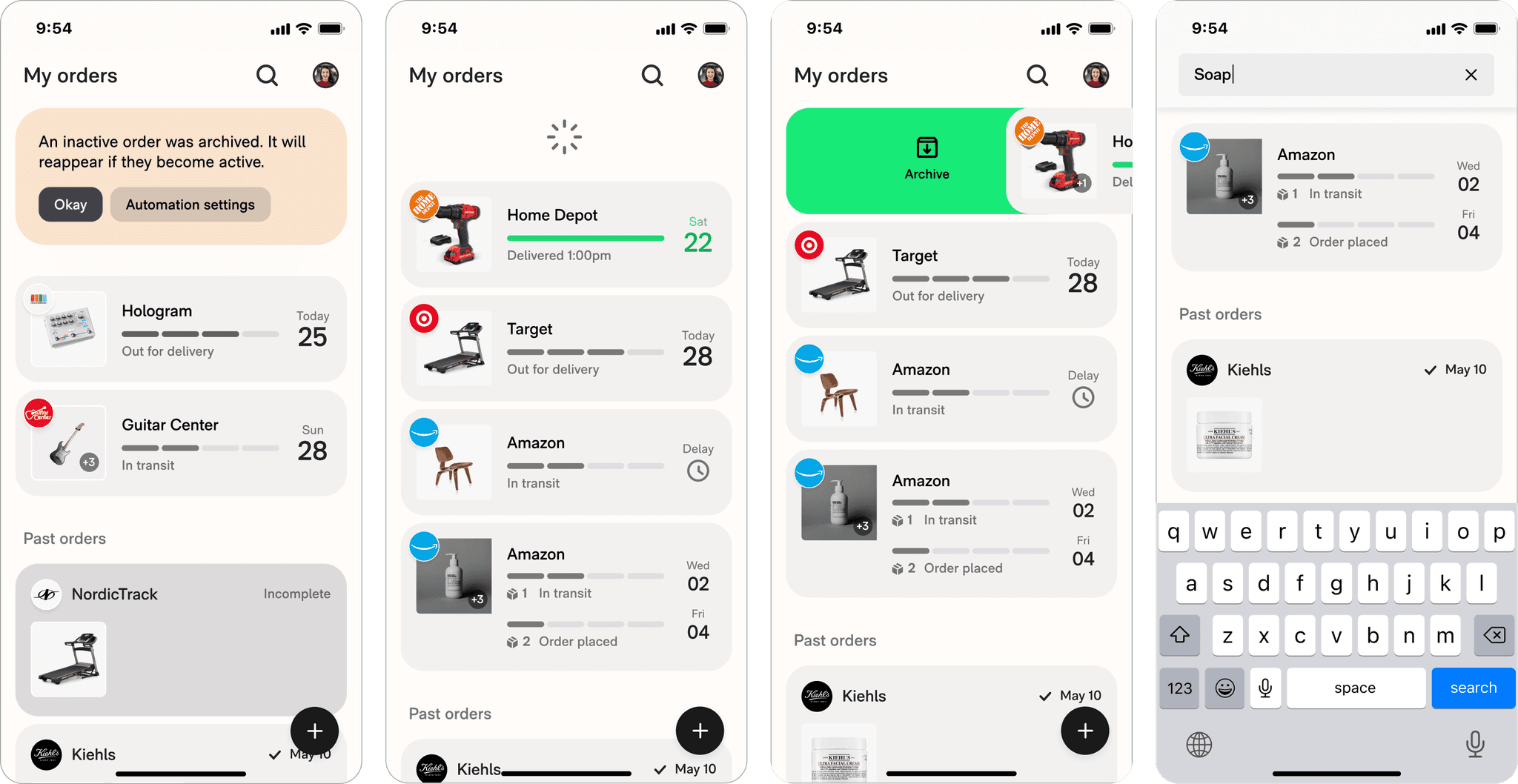 To help users easily get rid of inactive orders, we released an "archiving" swipe function. It got some traction but users were still overwhelmed by an avalanche of inactive orders after just a few days.