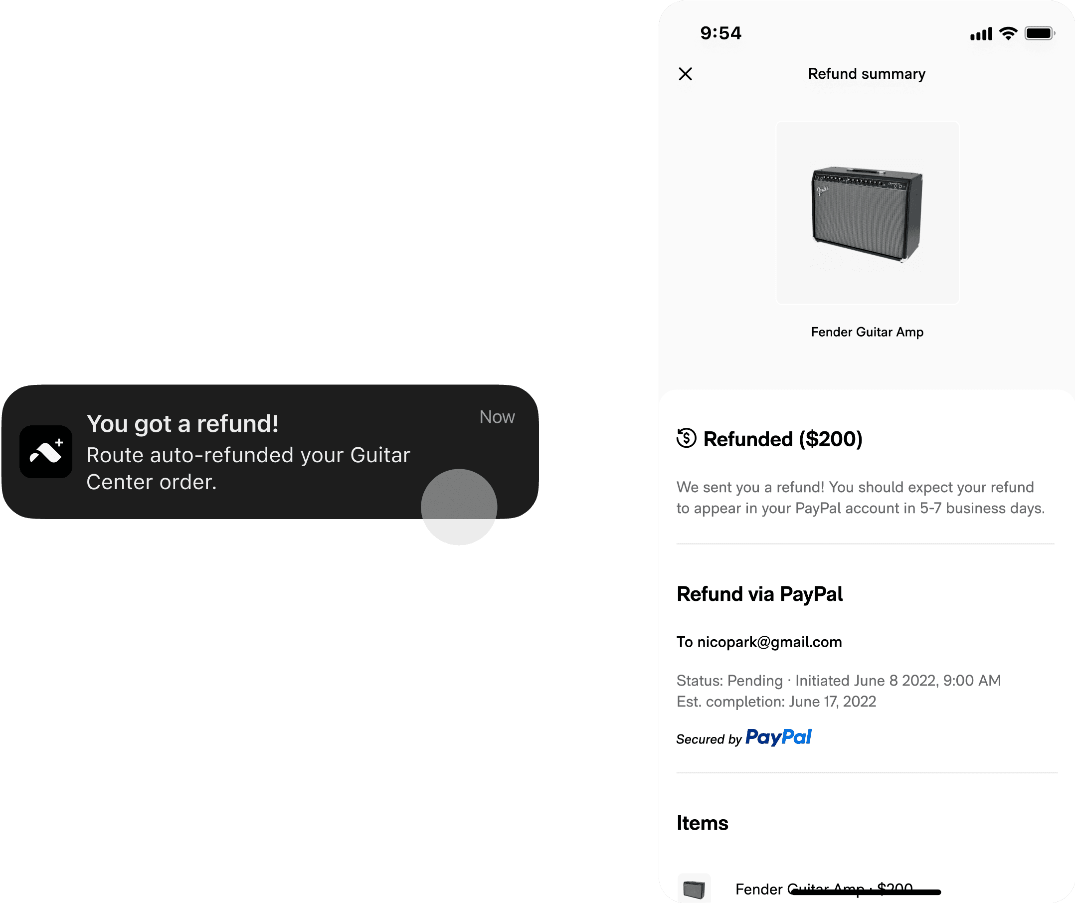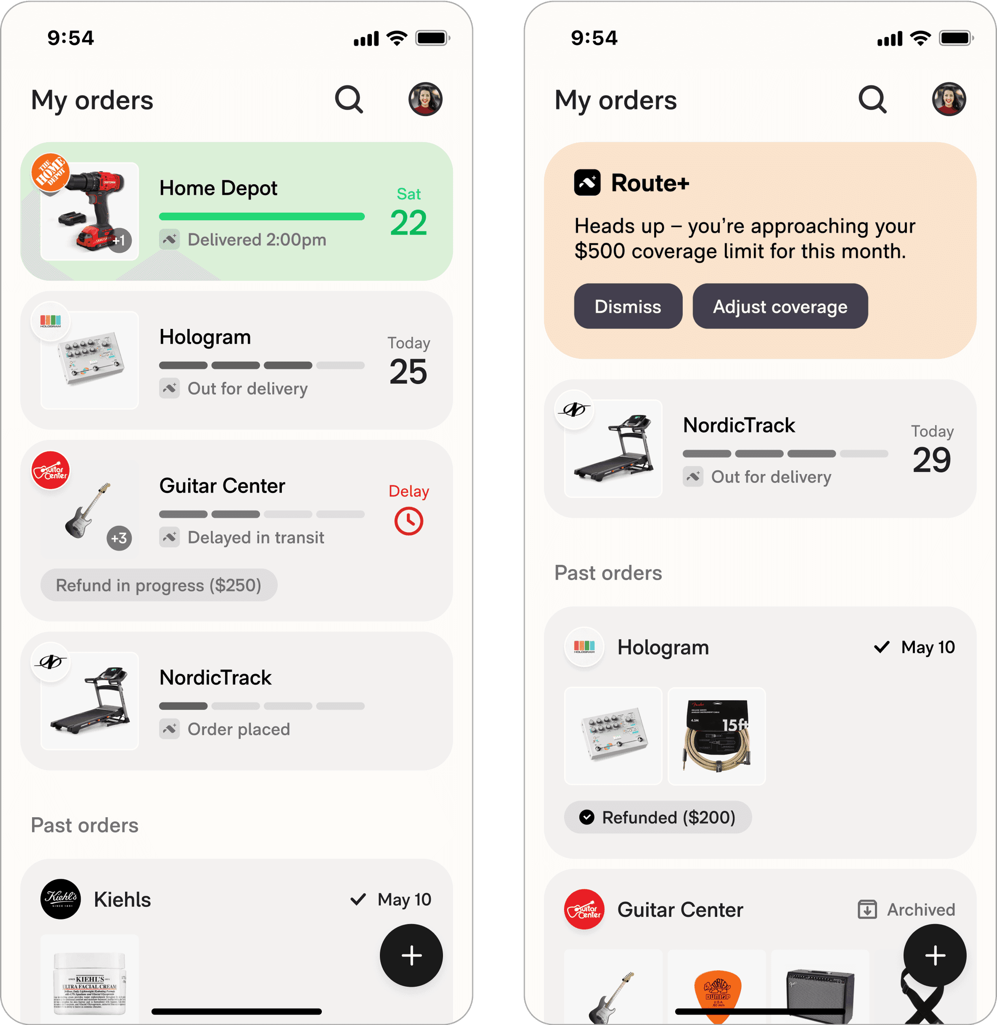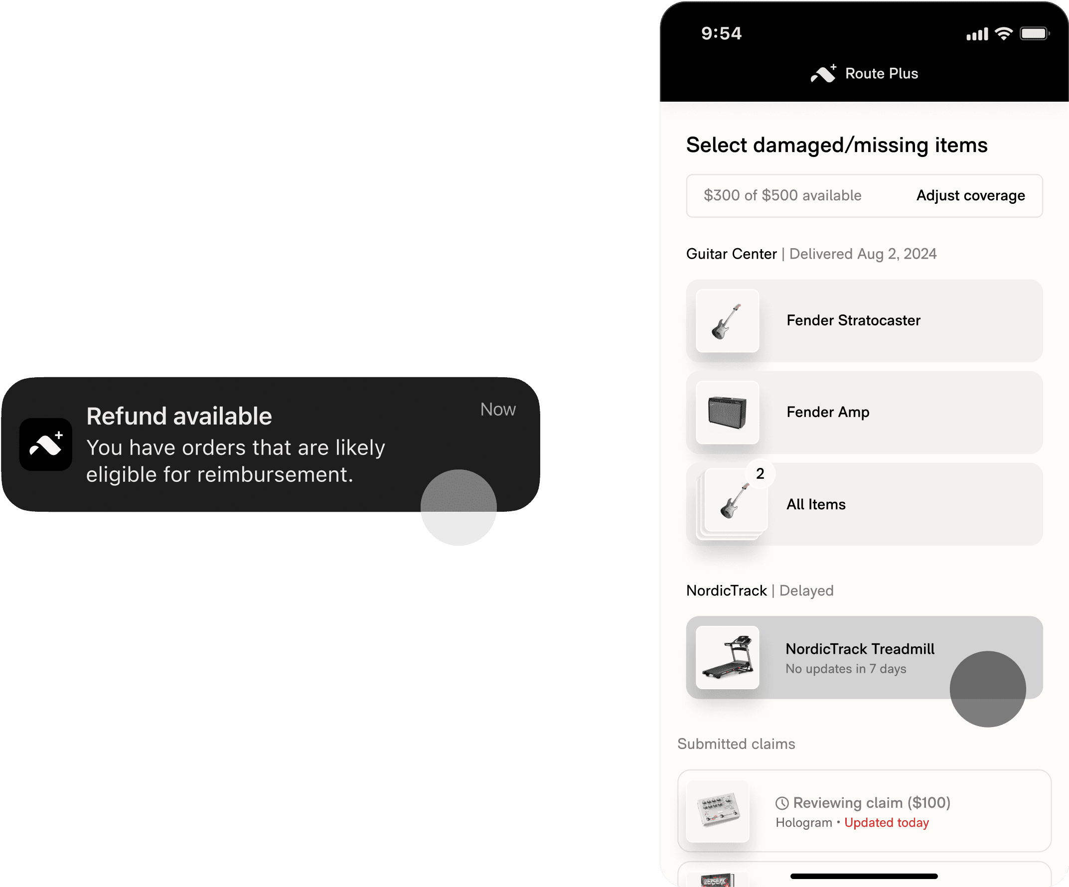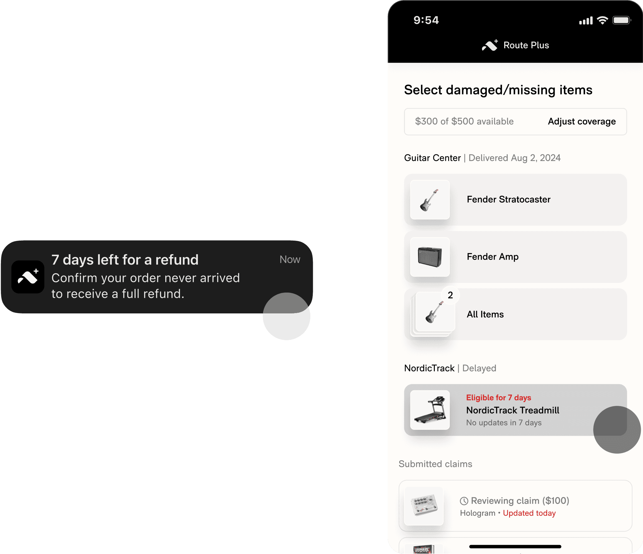 Refund progress and coverage limits are communicated on a user's tracking list, deferring the need to build a Route+ dashboard.