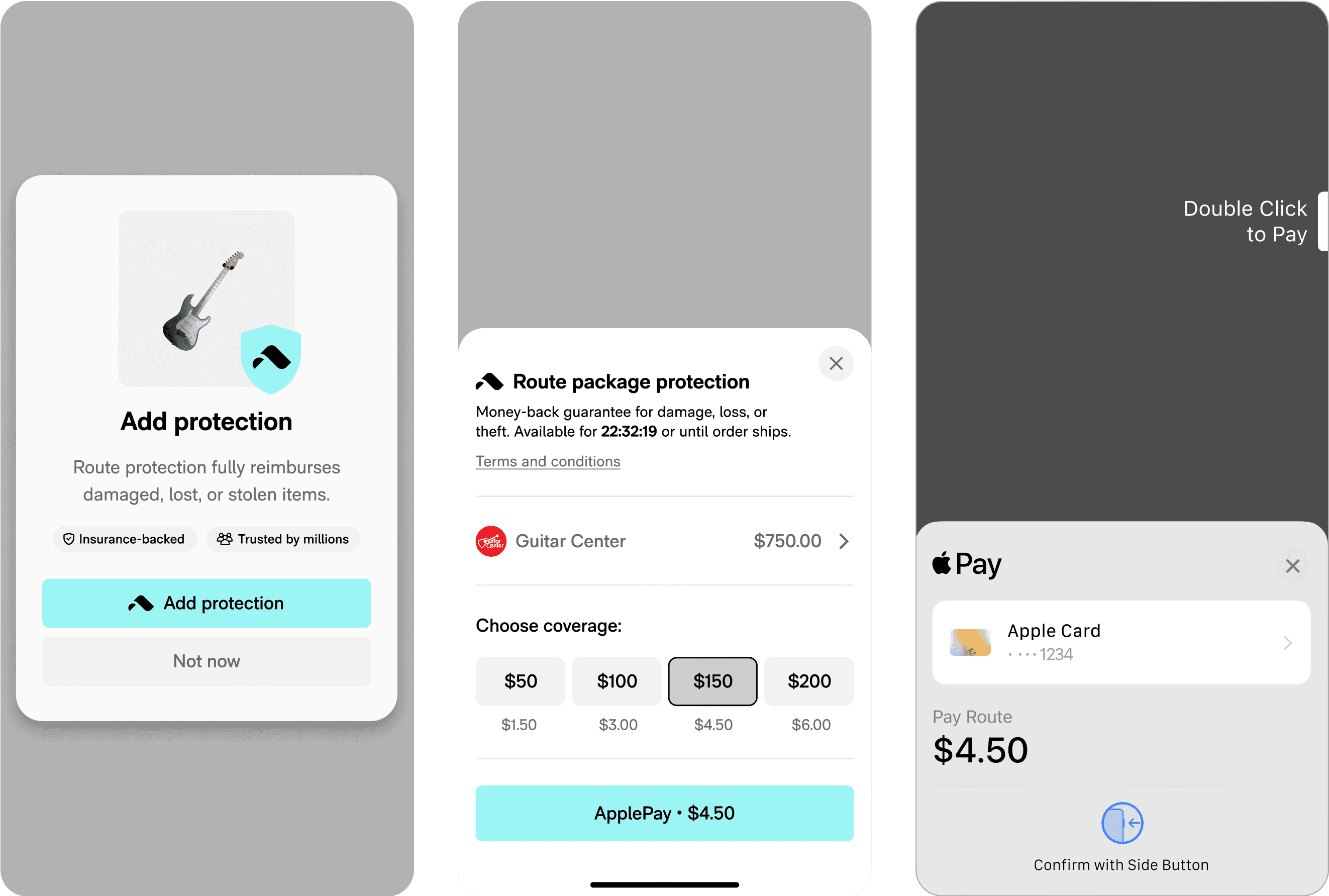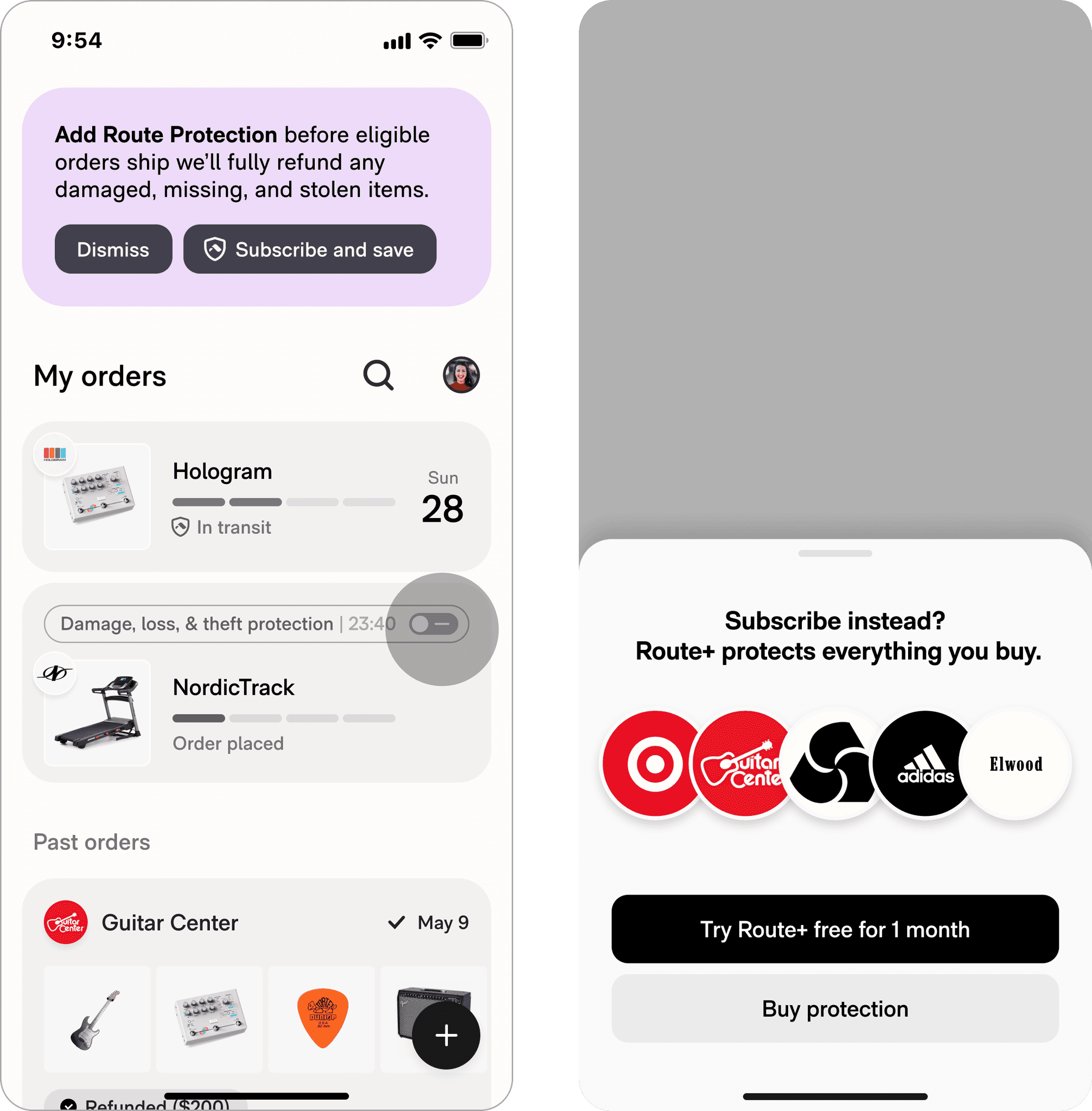 A user discovers Route+ as a free trial upsell offered as more economical and convenient alternative to buying a la carte proteciton.