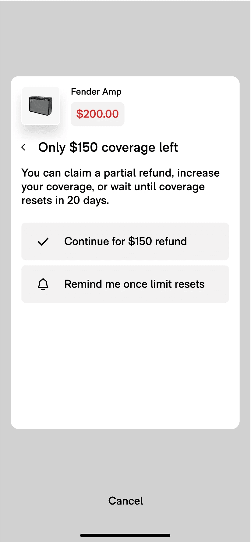 When a user hits their coverage limit, we give users a choice between partial refund or setting a reminder for when coverage resets.